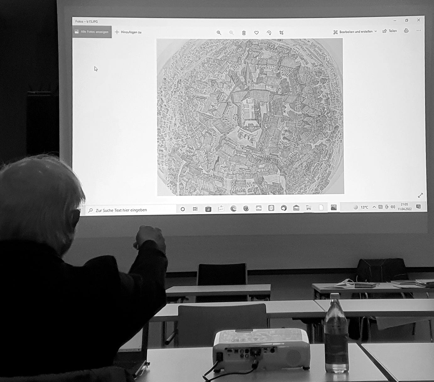 Nach den offiziellen Tagesordnungspunkten gab Wolfgang Himmelmann noch einen kleinen Einblick in die Geschichte des Ortes Eppingen. Er hatte in aufwändiger Detailarbeit den Fachwerk-Kern dieses Ortes rekonstruiert und seine Zeichnungen in einer Ausstellung in Eppingen vorgestellt. Das Besondere der Zeichnungen: Sie zeigen den Ort, wie ihn ein Falke hoch über dem Ortskern sieht, mit einem nahezu vollständigen Rundumblick. Wolfgang Himmelmann zeigte in dem rund 20-minütigen Vortrag sowohl seine Arbeitsweise wie auch Besonderheiten von Eppingen, das über eine große Anzahl von 300- bis 500-jährigen Fachwerkhäusern verfügt. Vervollständigt hat er die Darstellung von Eppingen mit einer ähnlichen von Heidelberg, ausgehend von einem „Falkenblick" über der Heilig-Geist-Kirche. Anders als in Eppingen sind Fachwerkhäuser dort wegen Zerstörungen in Kriegen nicht zu finden.