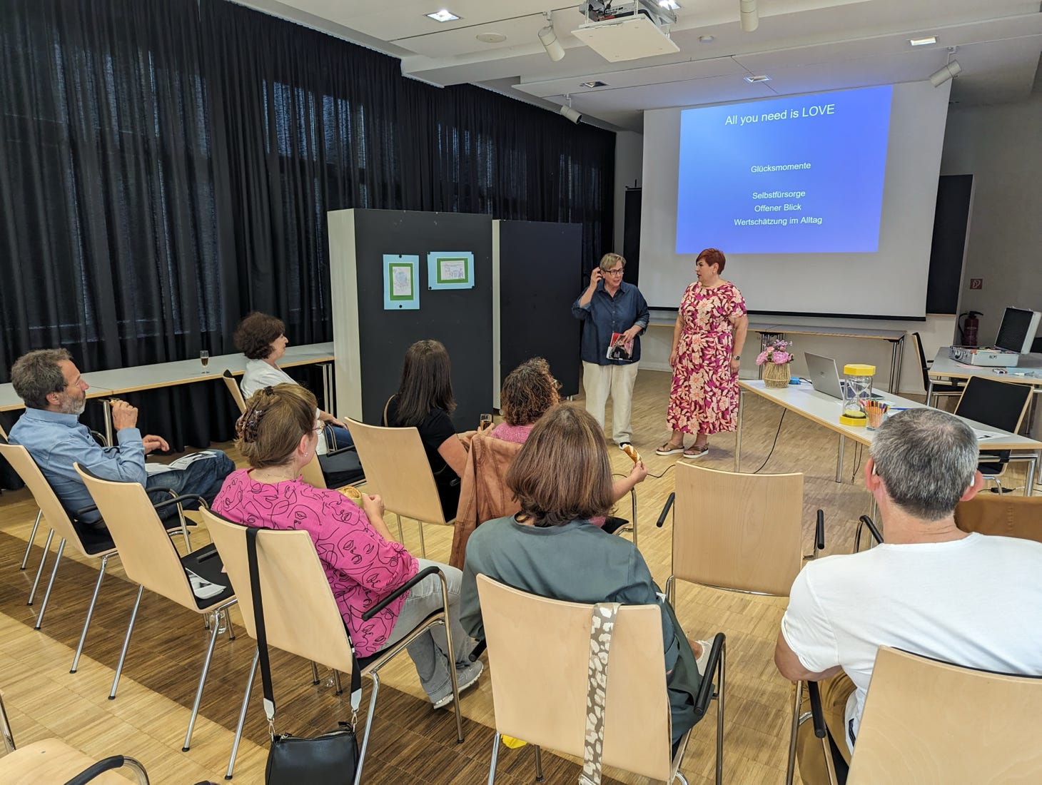 Offenbar interessiert das Thema „Liebe“ mehr Frauen als Männer. Das jedenfalls vermittelte das vorwiegend weibliche Publikum bei dem Vortrag „All you need is Love“ von Lilia Ungefug (im Bild rechts, neben Gudrun Hufnagel). Aus der jahrelangen Erfahung und ihren Kenntnissen im sozialpädagogischen Bereich machte sie darauf aufmerksam, wie viele Momente es im Alltag gibt, die man als glücklich empfinden oder Glück bringend entdecken kann. Insbesondere zählen dazu Zuspruch und Wertschätzung, Unterstützung und Trost von Mitmenschen – Liebe im weitesten Sinne. Mit Assoziativ-Notizen aus dem Publikum ließ sie etliche Alltagserlebnisse in dieser Hinsicht Revue passieren. Weitere Details HIER (Foto: Rolf Kickuth).
