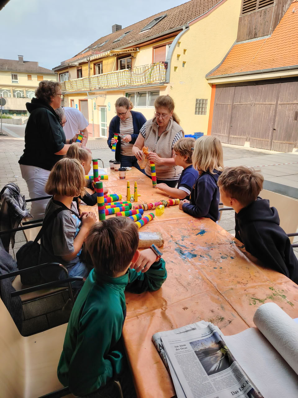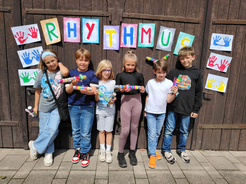 9.00Uhr: „Herzliches Willkommen“ an die Teilnehmer. Gleich ist „Leben“ im Hof... „Das sind wir und wer bist Du?“ Danach kurze Vorstellung des Ablaufs, die Tische mit den Materialien sprechen für sich... Los geht es mit der Gestaltung von Rhythmusinstrumenten. Eine Stunde sind wir alle sehr beschäftigt!