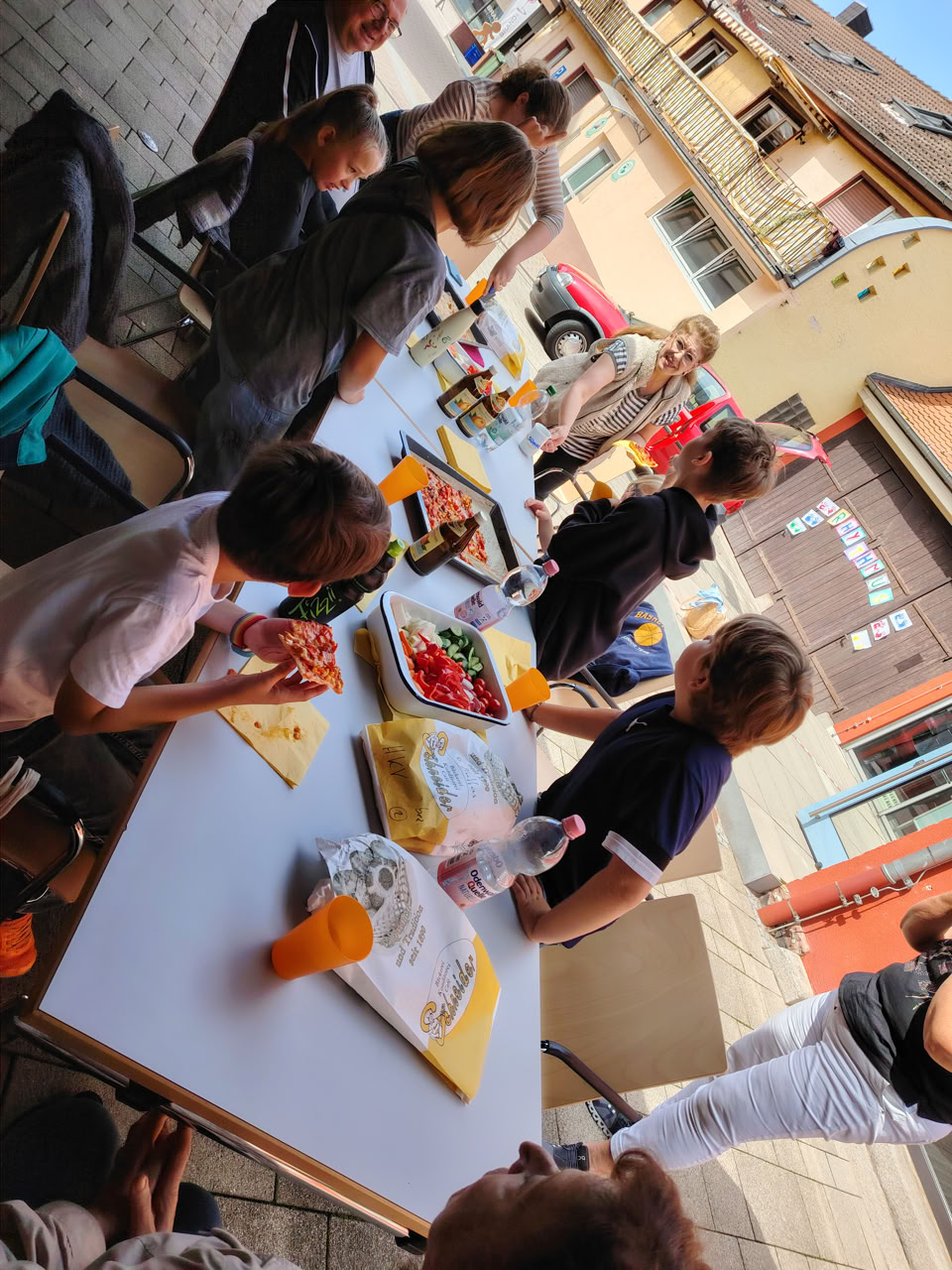 12.15Uhr: Helga und Eric haben uns Pizza gebacken, Wir sitzen im Hof an den Tischen und lassen sie uns schmecken. Dazu kühle Getränke und eine Riesenschale mit Obst und Gemüse. Und nach einer kleinen Weile legt sich ein ganz anderer „Groove“ auf uns nieder.. Wie der sich äußert? Entspannte Menschen unterschiedlichen Alters , die in angeregte Gespräche vertieft sind., die mit richtig Appetit die „Platten putzen“ und denen man ansieht, dass „Rhythmus im Blut“ Körper und Seele in Schwung gebracht hat.