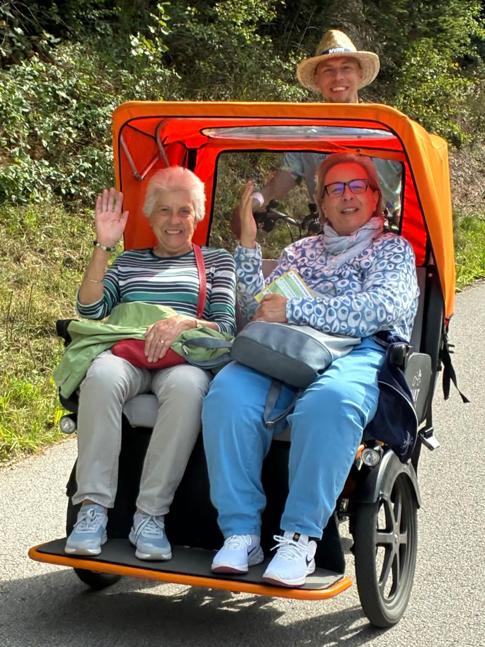 Bildunterschriften Die Reisegruppe / Ankunft im Hotel / Fahrt mit dem Rad-Taxi / Rote Schuhe als roter Faden / Niedriges Hochrad / Kleine Pause / Abend im Hotel (alle Bilder: Gudrun Hufnagel bzw. Neil Bushill (Rad-Taxi))